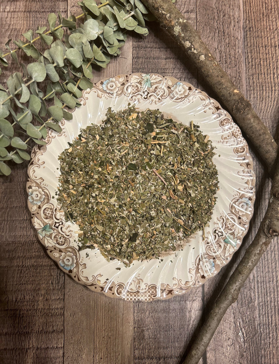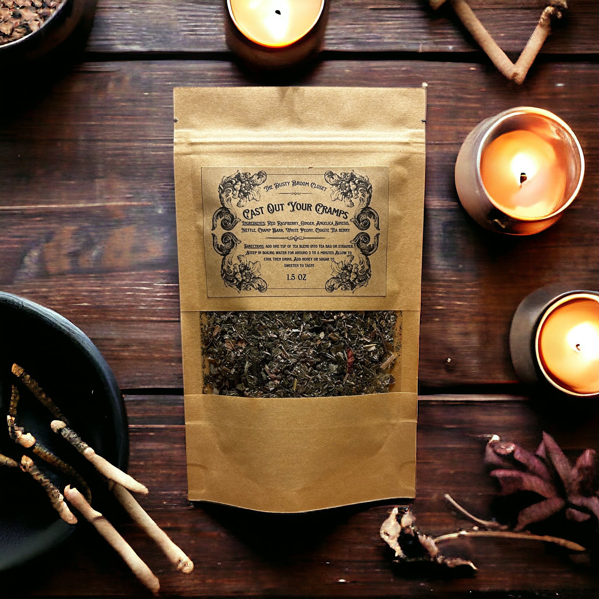 Cast Out Your Cramps Tea is a unique herbal blend made to help relieve cramps easing period pain, aids in shortening the length of you period, and relieves other discomfort associated with mensuration. It can also be taken as a PMS relief. Remember periods shouldn't hurt and you shouldn't be miserable doing your everyday tasks. If your period is "unbearable" please seek out medical attention.ย